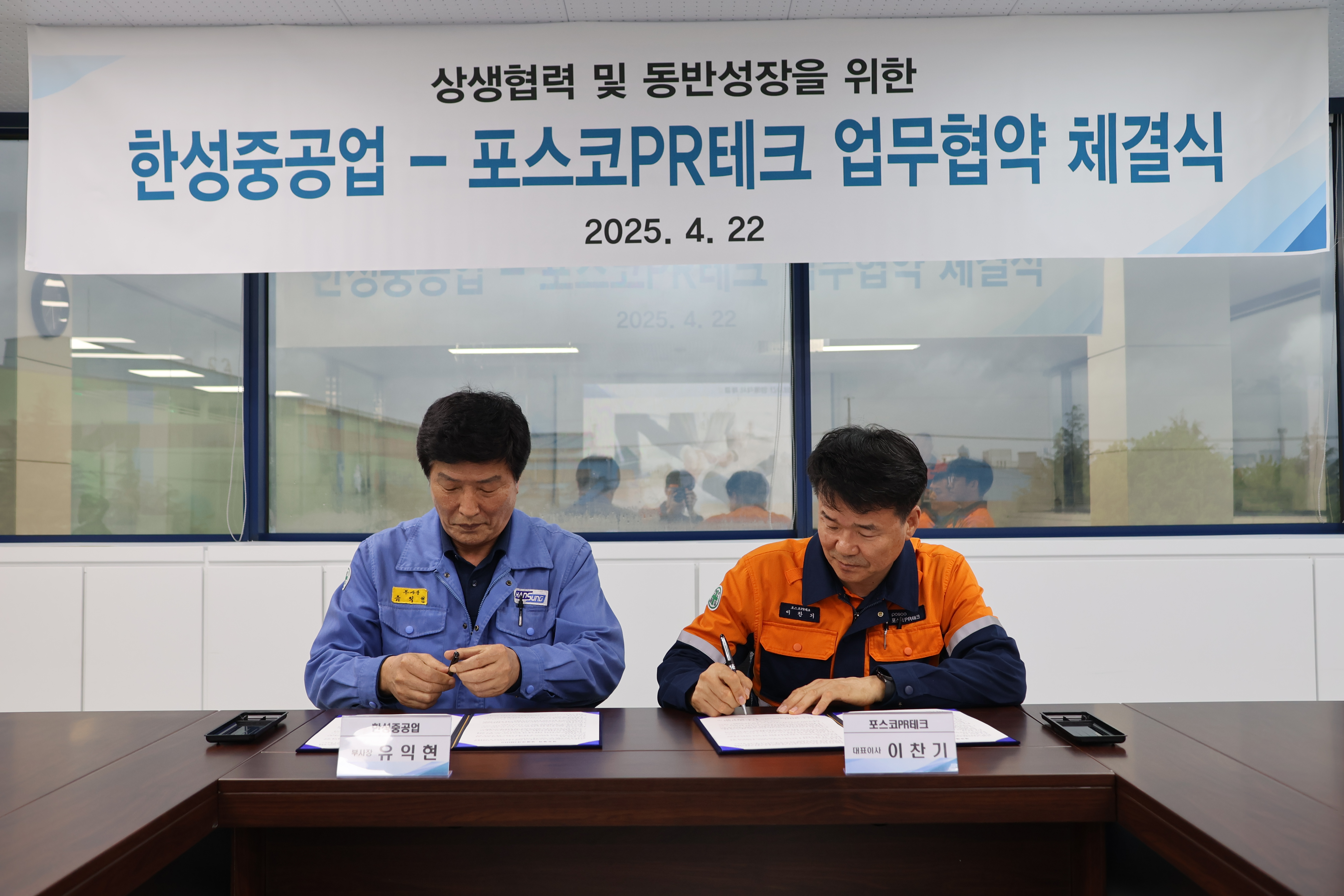 ▲ 포스코PR테크가 4월 21일 한성중공업가ㅗ 기술력 향상과 공동 수주 확대를 약속했다. 왼쪽부터 유익현 한성중공업 부사장, 이찬기 포스코PR테크 사장.